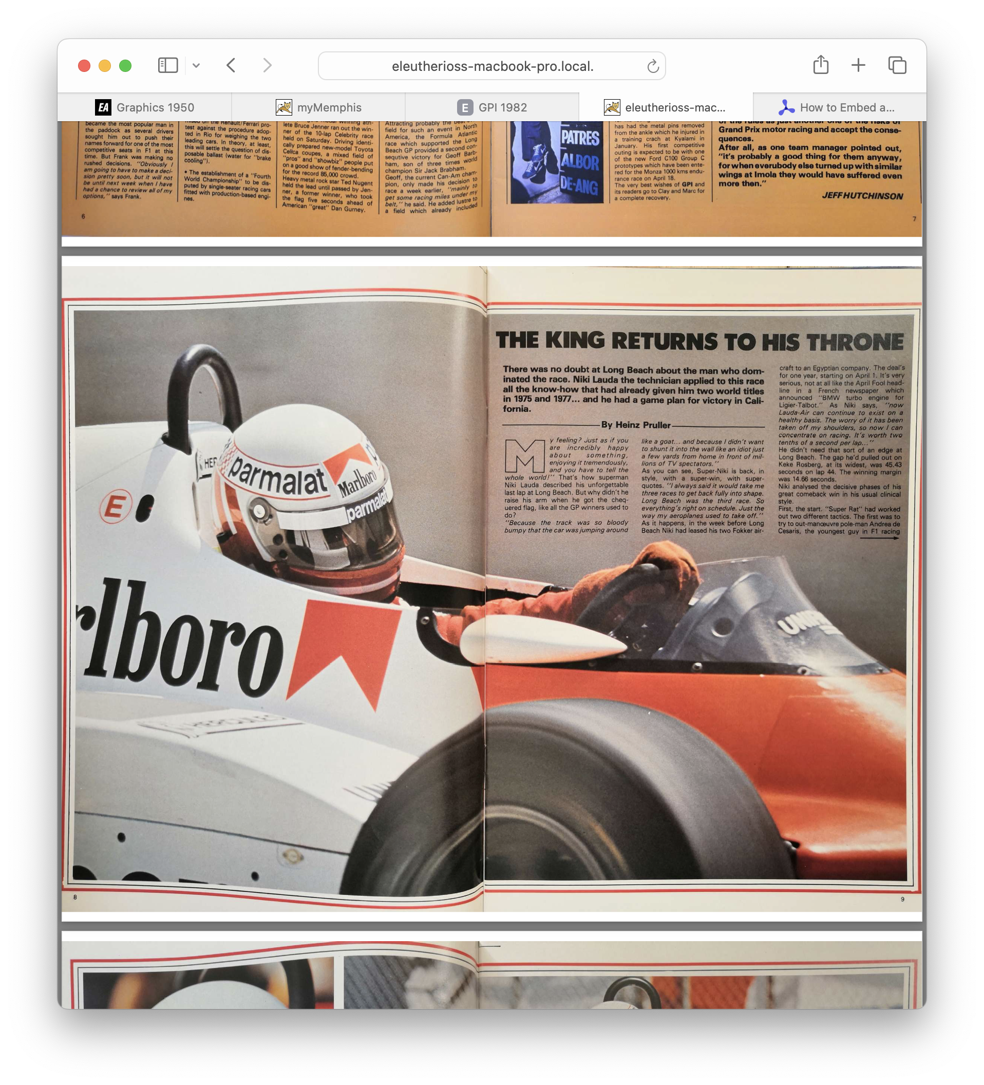Irgendwo in diesem Blog habe ich das GPI Magazin schon mal erwähnt. In Stuttgart habe ich es regelmässig gekauft, und schon vorher hatte ich es als Schüler gesehen (Kiosk?). Fotos von den Cahiers, die Cutaways von Piola, beigelegte Poster, Stories zu den Fahrern, technische Details, Essays von bekannten Autoren - all das hat sich hier für mich zum ersten Mal erschlossen. Es gab am Anfang eine englische, eine deutsche und eine französische Version des gleichen Heftes. Zudem erschienen die Hefte anfangs auch zu jedem Rennen, später monatlich. Mitte 1986 war dann Schluß - das Magazin war hochwertig, aber in der Produktion einfach zu teuer. Ich habe, wo immer es ging, ältere Ausgaben gekauft, aber längst noch nicht alle zusammen. Der Zahn der Zeit und diverse Umzüge haben ihnen aber doch zugesetzt.