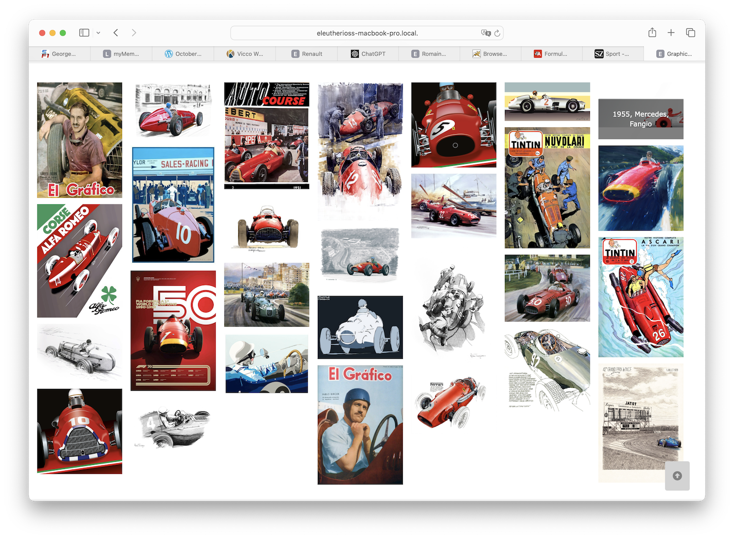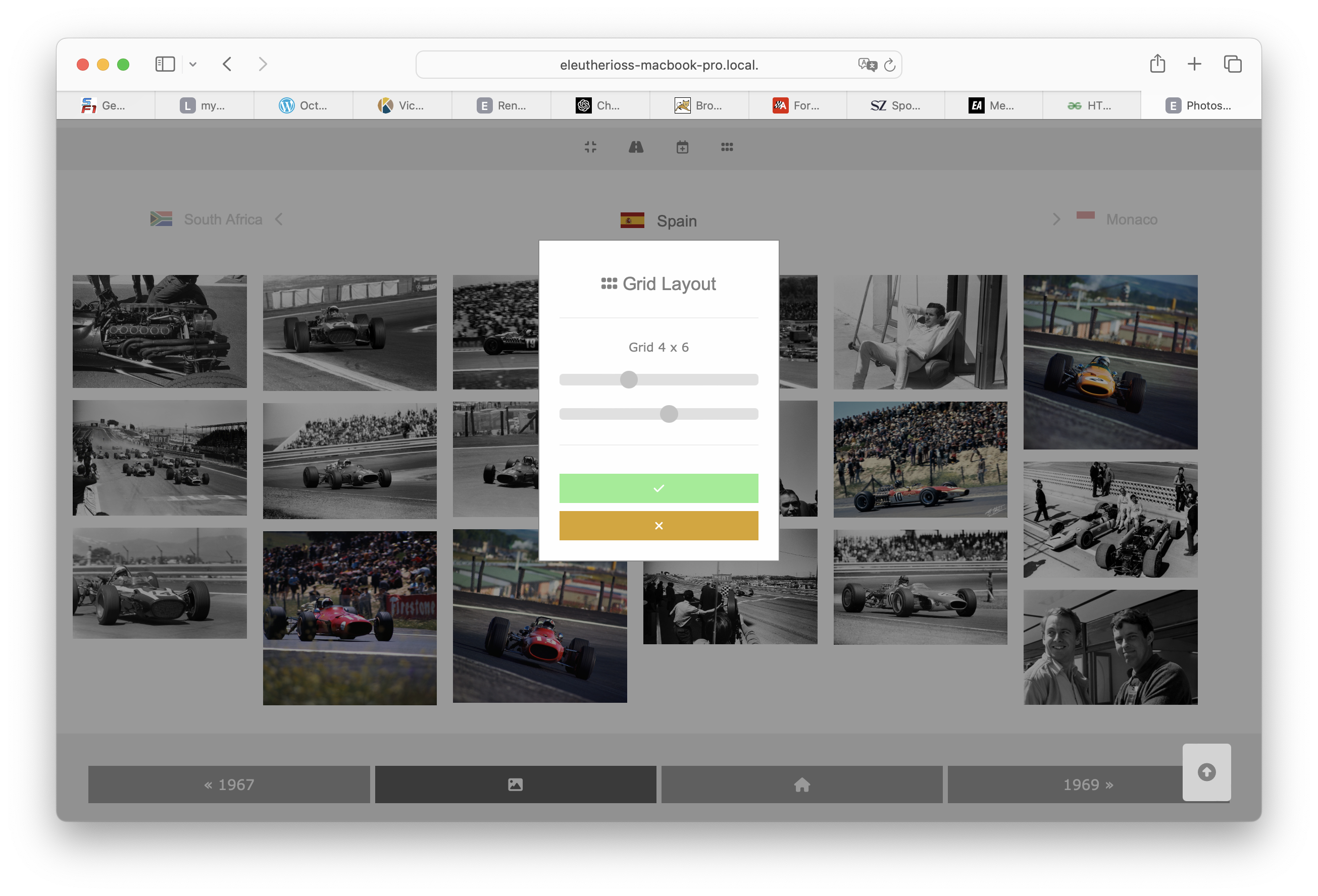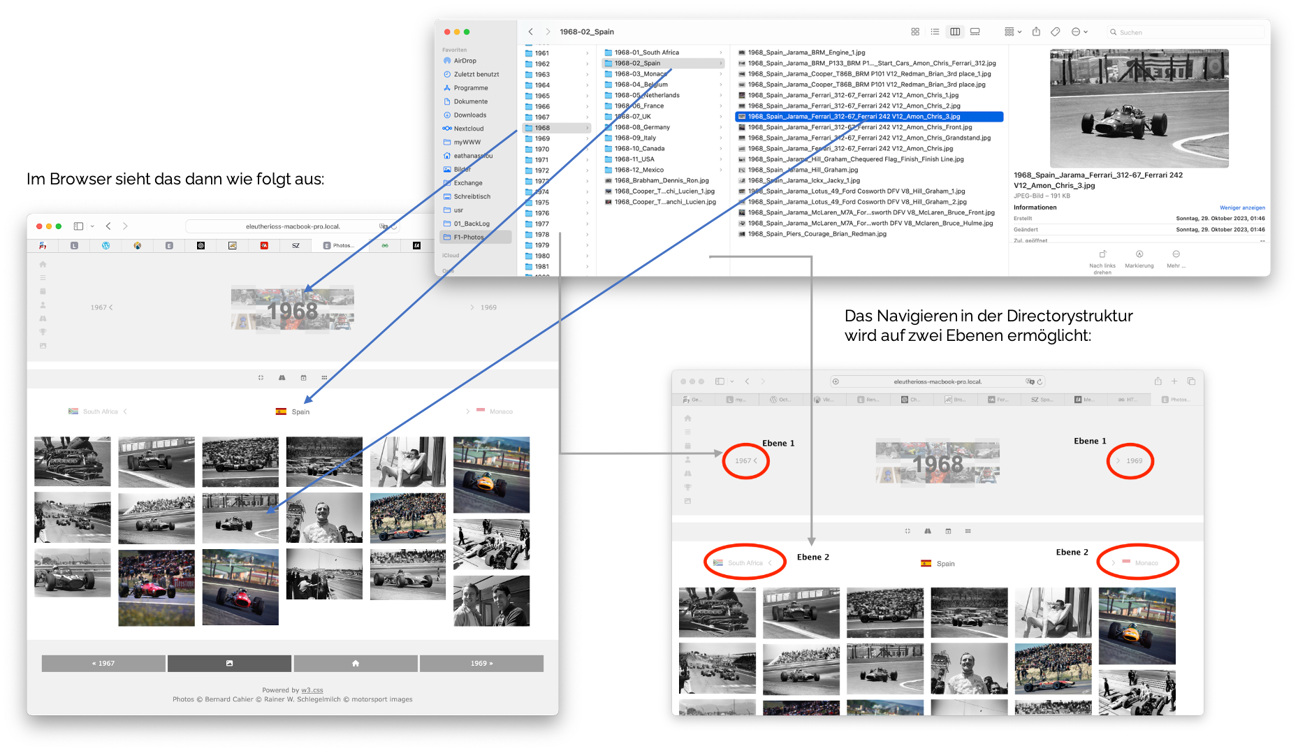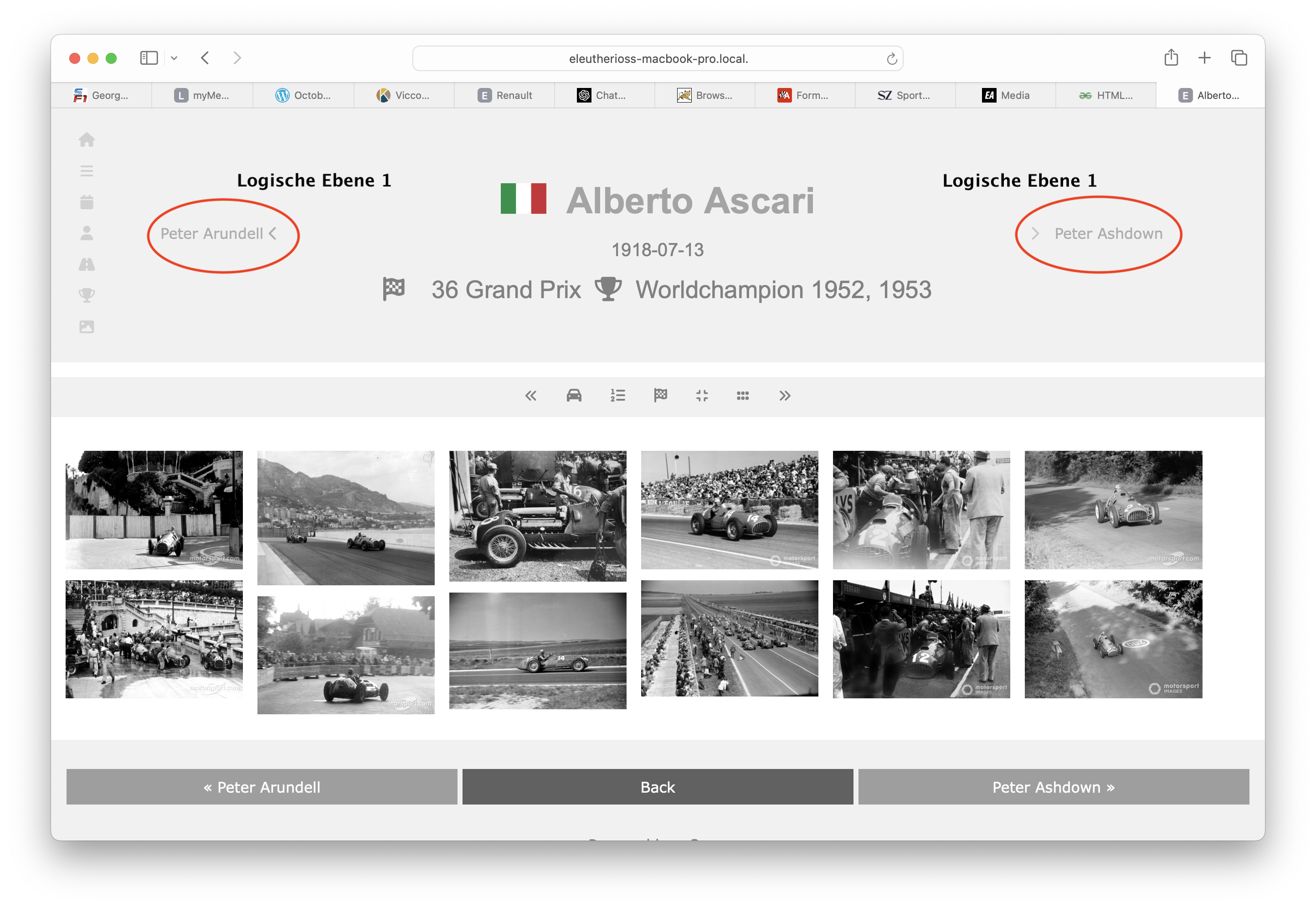 Sauro Torrregiani will jedes F1 Fahrzeug seit 1950 zeichnen. OK, er ist dran, und ich folge ihm dabei. Ich weiß nicht warum, aber das war bei mir ein "Trigger" - ich wollte von jedem Fahrzeug eines Teams Fotos haben, von jedem Fahrer, von seinen Fahrzeugen, von jedem Rennen. Das mit den Fotos hat etwas Zeit beansprucht, der URLDownloader war beschäftigt, und das Taggen aus der Datenbank heraus und manuell bei einzelnen Bildern dauerte seine Zeit. All das Taggen und Indizieren dient aber nur dazu, aus den Fotos (ca. 70.0000 Stück) geeignet selektieren zu können - nach Fahrer, Team, oder Wagen. Das wird mit Lucene und einem Index auf dem kunstvoll erstellten Dateinamen bewerkstelligt. Nun muss man die Auswahl aber auch geeignet durchblättern und anschauen können, das nannte man mal "Foto/Bild/jpg-Browser" bevor "Browser"" die Bezeichnung für einen WWW-Client wurde.