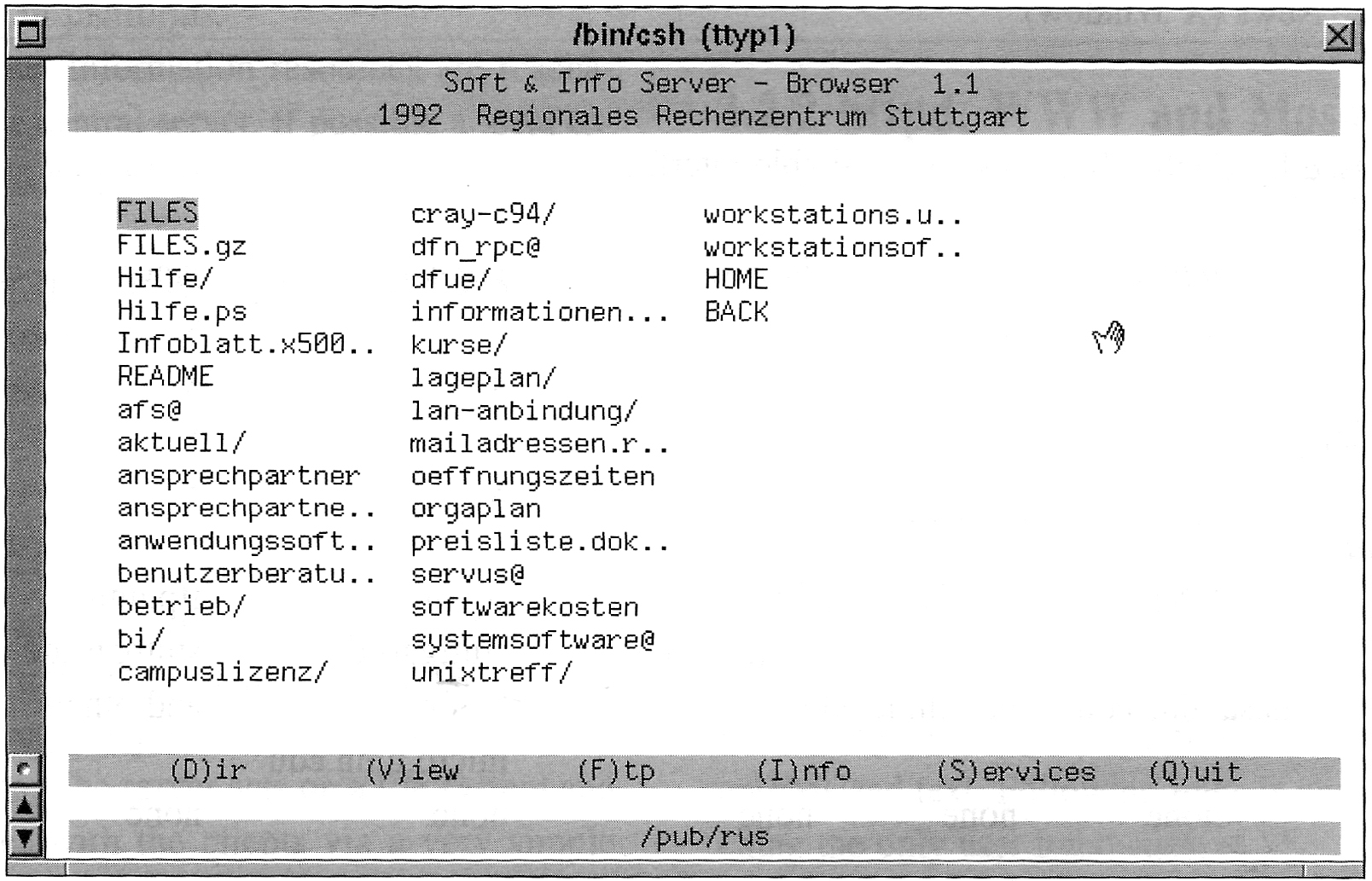 Und auch hier gibt es einen Brückenschlag in die frühen 90iger Jahre ... Bevor wir uns am RUS mit gopher oder WWW beschäftigt haben, habe ich einen Browser für VT100 Terminale geschrieben, mit dem man den ftp Server duchbrowsen konnt. Man konnte mit den Pfeiltaten von Datei zu Datei scrollen, wählte eine Datei aus, konnte einen Infotext zur Datei lesen, in die Datei reinschauen und mit einer Taste herunterladen. Es war so etwas wie der Finder unter MacOS, oder der Windows Explorer für MS-Windows, mit Download Funktion.