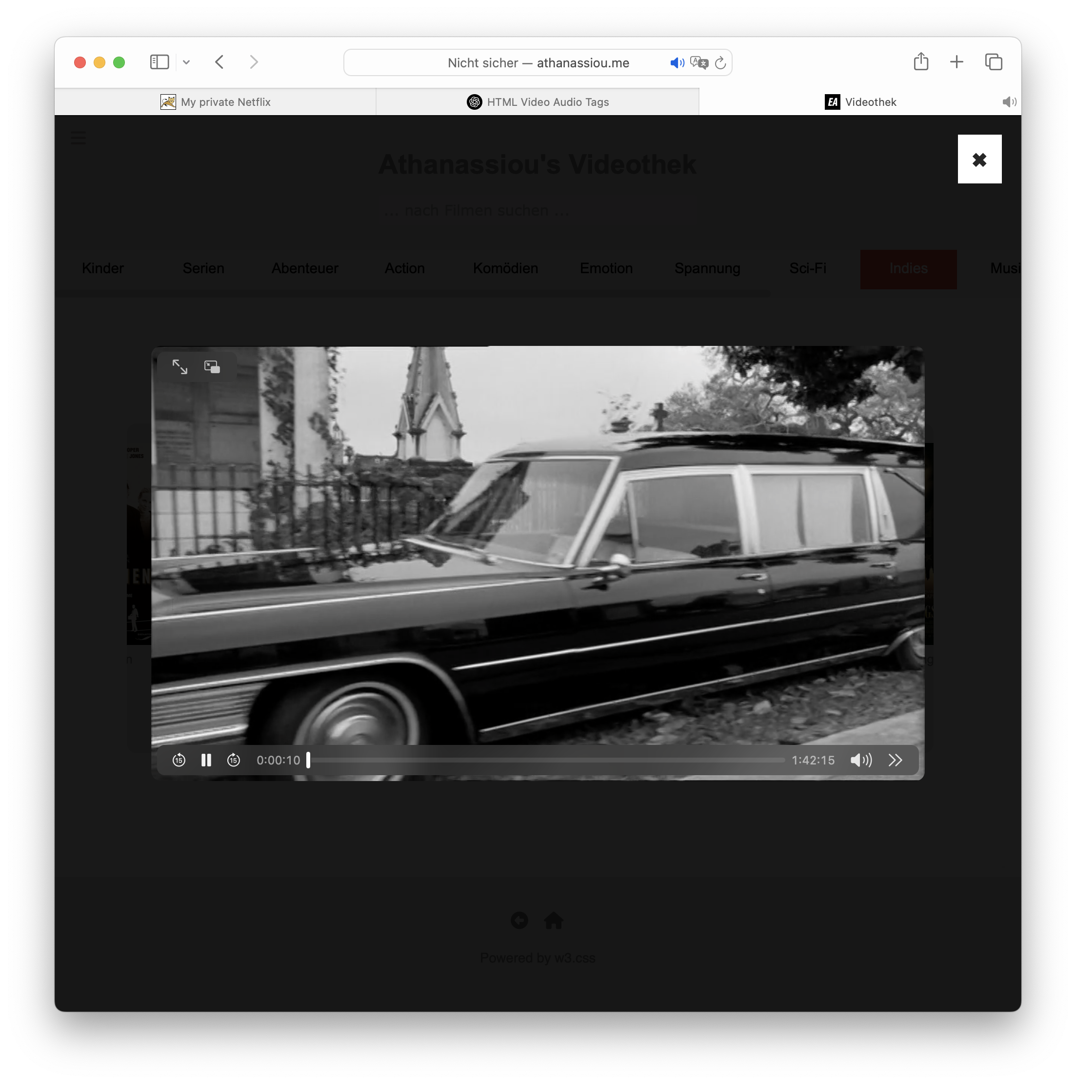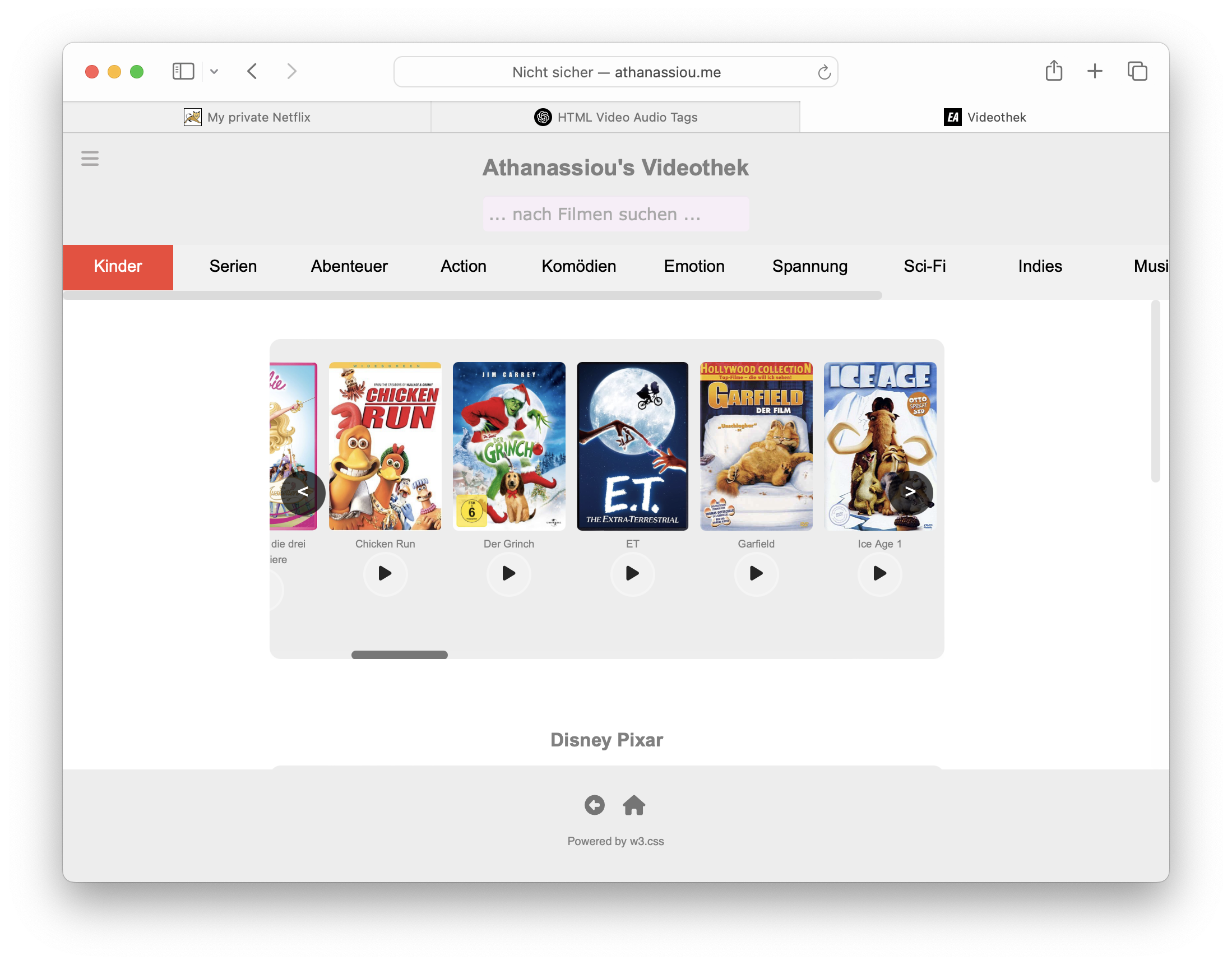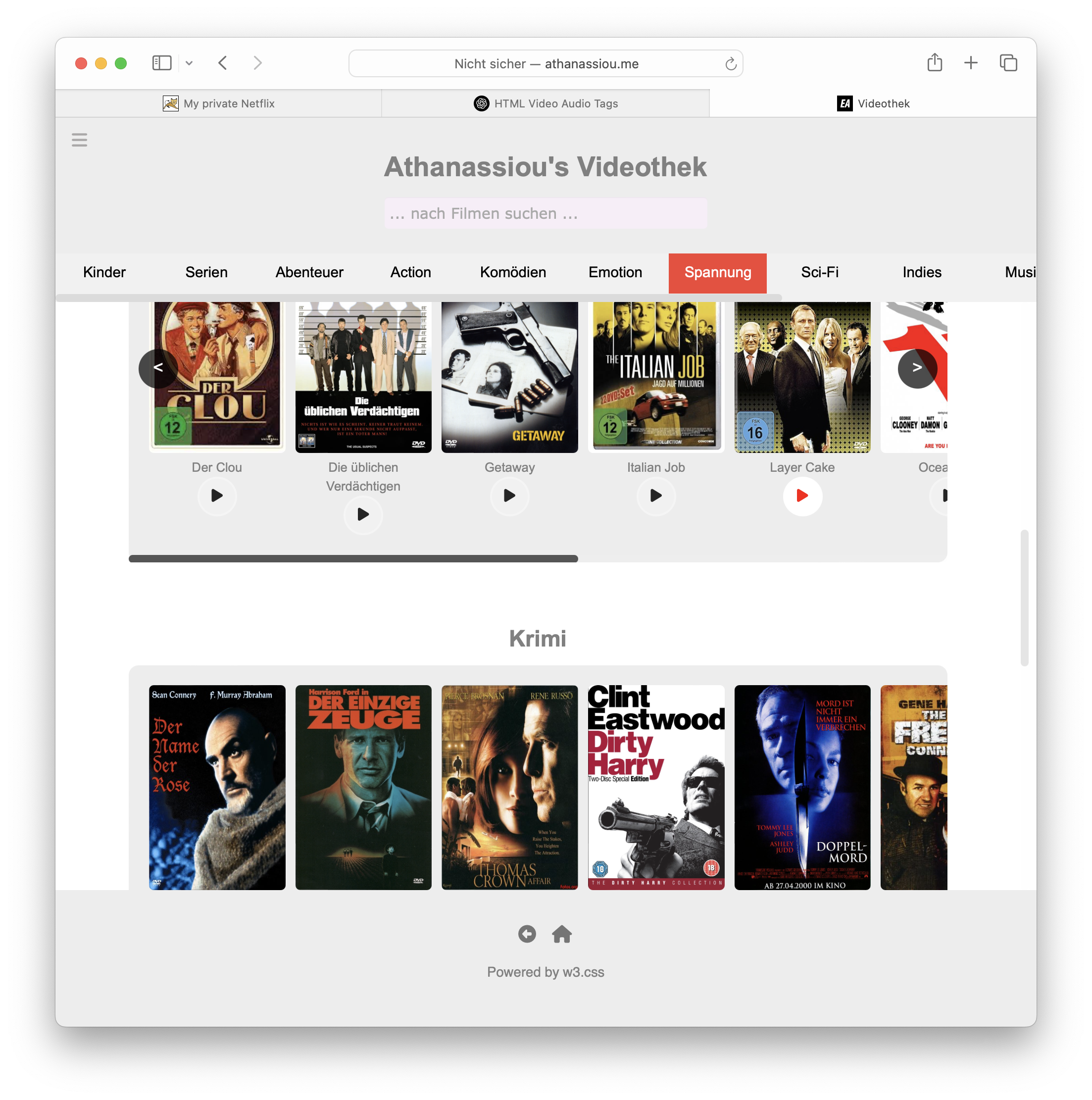 Der einfache Videobrowser für die privaten Videoschnipsel war für die DVDs nicht geeignet. Zur Gestaltung stand bald ein Entwurf mit horizontal scrollbaren Postern der Filmen à la Netflix im Raum. Den Kern habe ich mit ChatGPT entwickelt, aber hier war im weiteren Verlauf viel manuelle Codierung und CSS Feinschliff nötig, um das volllständig responsive und flexible Design umzusetzen.