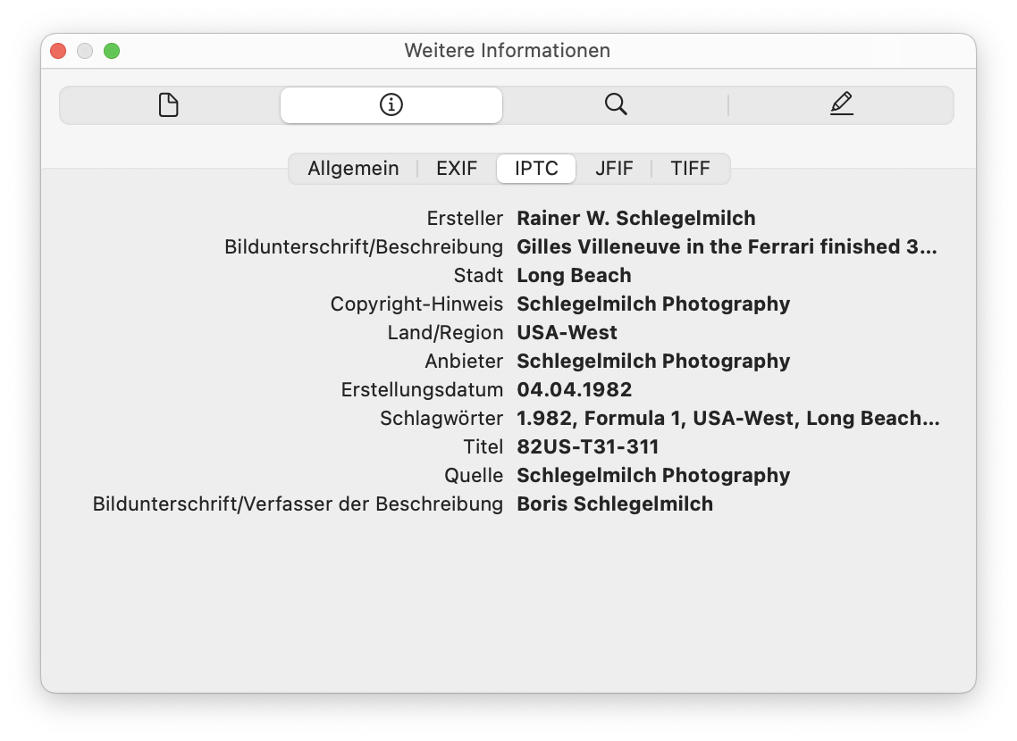 Es gibt neben dem IPTC Tags noch weitere Metadaten in Bilddateien, die speziell von und für Kamerahersteller sind (EXIF). Unter MacOS kann man sich die Tags anzeigen lassen, die Vorschau App hat entsprechende Features: